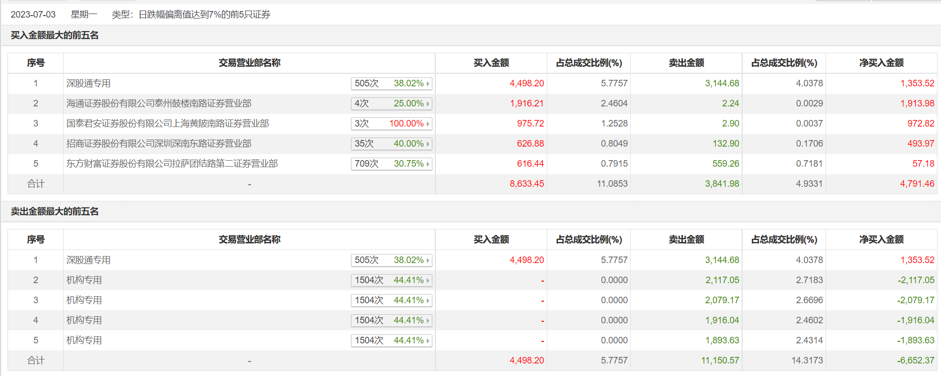 久远银海7月3日跌停,龙虎榜数据显示,上榜营业部席位全天成交2.05亿元,占当日总成交金额比例为26.3%。其中,买入金额为8633.45万元,卖出金额为1.18亿元,合计净卖出3214.42万元。