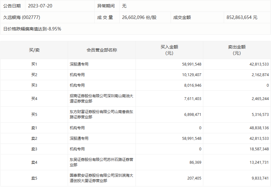 7月20日,久远银海今日跌停,龙虎榜数据显示,上榜营业部席位全天成交2.35亿元,占当日总成交金额比例为27.58%。其中,买入金额为9194.15万元,卖出金额为1.43亿元,合计净卖出5131.76万元。