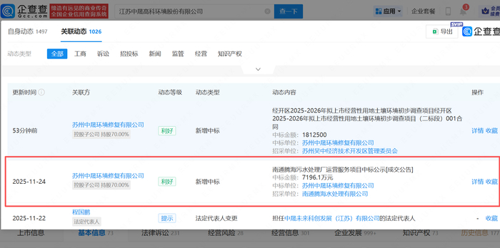 企查查APP显示,中晟高科控股公司苏州中晟环境修复有限公司中标南通腾海水处理有限公司污水处理厂项目,中标金额7196.1万元。中晟高科(002778)为苏州中晟环境修复有限公司控股股东,持股70%,南通腾海水处理有限公司成立于2021年,由国资江苏腾海投资控股集团有限公司100%控股,经营范围包含:污水处理及其再生利用;水污染治理;水环境污染防治服务;智能水务系统开发等。