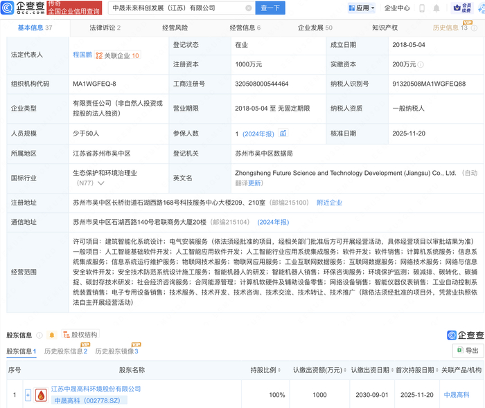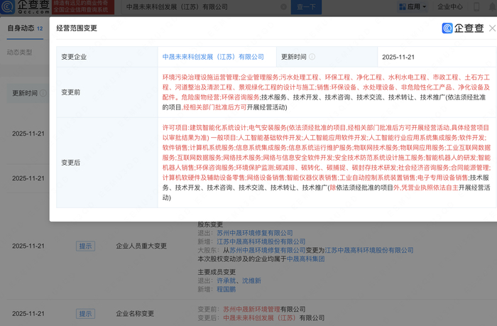 企查查APP显示,近日,原苏州中晟新环境管理有限公司发生工商变更,企业名称变更为中晟未来科创发展(江苏)有限公司,苏州中晟环境修复有限公司退出股东行列,新增中晟高科(002778)为全资股东。同时,公司经营范围变更为人工智能应用软件开发、人工智能行业应用系统集成服务、物联网技术服务、智能机器人的研发、智能机器人销售等。企查查信息显示,该公司成立于2018年,法定代表人为程国鹏。