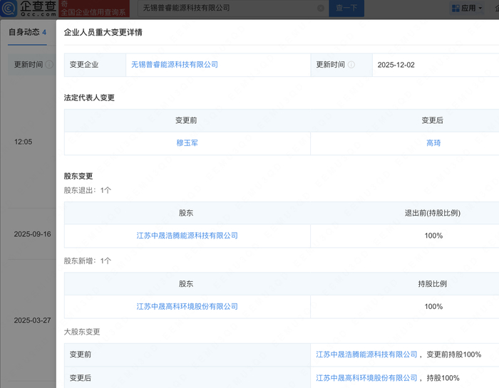 企查查APP显示,近日,无锡普睿能源科技有限公司发生工商变更,江苏中晟浩腾能源科技有限公司退出股东行列,由中晟高科(002778)直接全资控股,同时法定代表人为由穆玉军变更为高琦。企查查信息显示,该公司成立于2024年,经营范围包含:新兴能源技术研发;光伏设备及元器件销售;风电场相关装备销售;新能源原动设备销售;储能技术服务等。