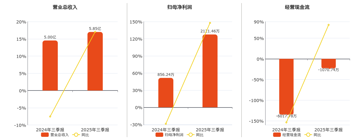 公司营业总收入为5.85亿元,在已披露的同业公司中排名第19。归母净利润为2121.46万元,在已披露的同业公司中排名第20。经营活动现金净流入为-1070.74万元,在已披露的同业公司中排名第21。