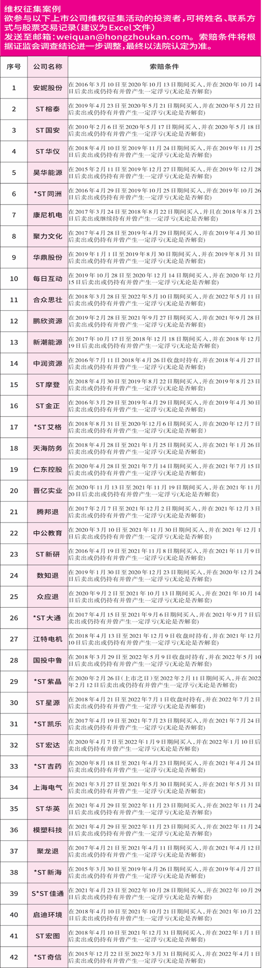 基于以上违法事实,根据相关司法解释,如果投资者于2015年12月22日至2022年3月31日期间买入*ST奇信,并在2022年4月1日后卖出或仍持有并曾产生一定浮亏(无论是否解套)均可发起索赔,您可登录证券市场红周刊官网,通过“民间维权”频道进行在线维权,参与由《证券市场红周刊》“民间维权”栏目组织的索赔征集活动,以维护自身合法权益。广大投资者在获得赔偿前无需支付任何律师费用。