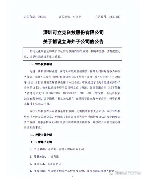 近日,深圳可立克科技股份有限公司发布公告,拟通过香港可立克及新加坡弘廷两家子公司,在墨西哥设立海外子公司,投资总额不超过5亿元人民币。
