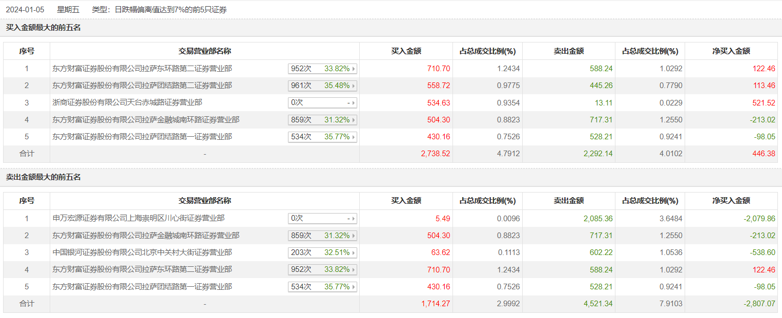 凯龙股份1月5日跌8.83%,全天换手率达16.43%,振幅达8.09%。龙虎榜数据显示,营业部席位合计净卖出2172.08万元。其中,申万宏源证券有限公司上海崇明区川心街证券营业部、东方财富证券拉萨金融城南环路证券营业部分别卖出2085.36万元、717.31万元;东方财富证券拉萨东环路第二证券营业部、东方财富证券拉萨团结路第二证券营业部分别买入710.70万元、558.72万元。
