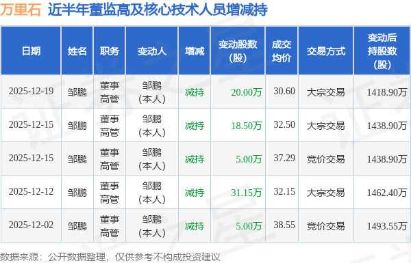 万里石:12月19日高管邹鹏减持股份合计20万股