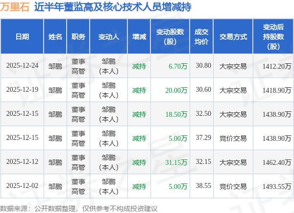 万里石:12月24日高管邹鹏减持股份合计6.7万股