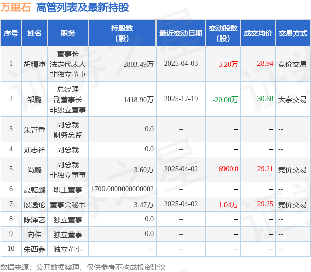 万里石的高管列表及最新持股情况如下: