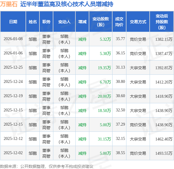 万里石:1月8日高管邹鹏减持股份合计5.32万股
