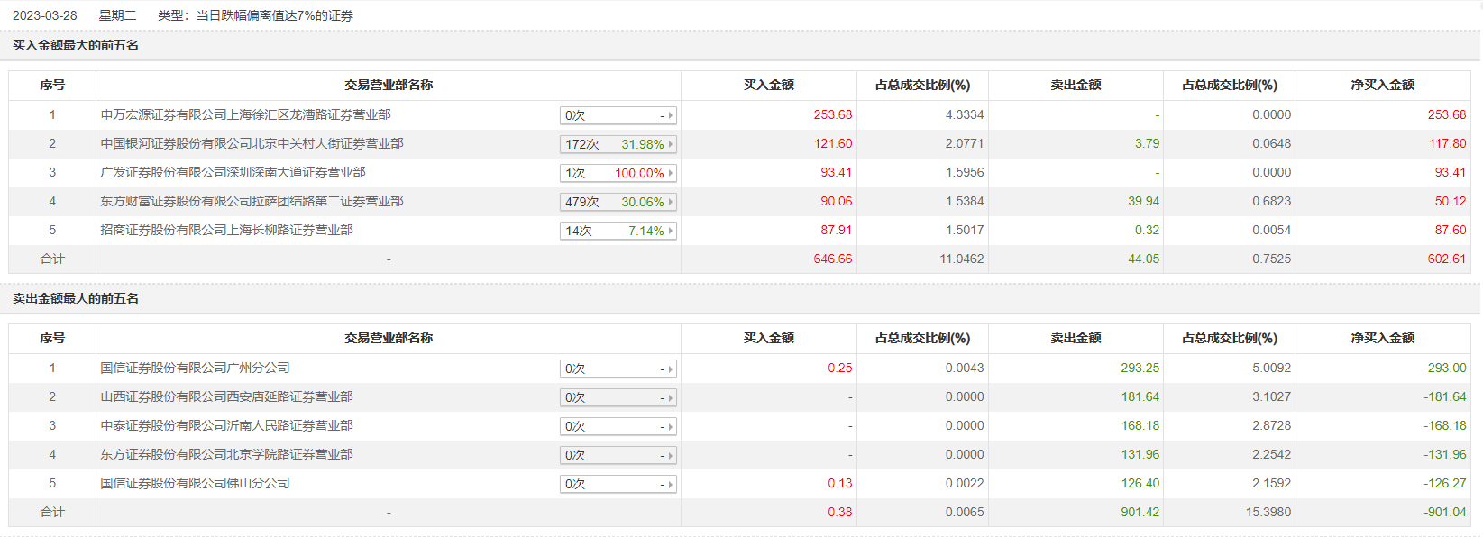 具体来看,国信证券广州分公司、山西证券西安唐延路证券营业部分别卖出293.25万元、181.64万元;申万宏源证券有限公司上海徐汇区龙漕路证券营业部、中国银河证券北京中关村大街证券营业部分别买入253.68万元、121.60万元。