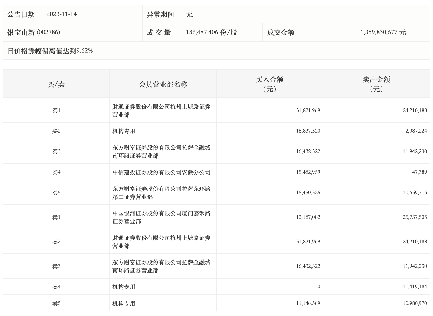 11月14日,银宝山新今日涨停,全天换手率达27.62%,振幅达7.31%。龙虎榜数据显示,营业部席位合计净买入2337.43万元。其中,机构买入2998.41万元,卖出2538.74万元,合计净买入459.67万元。此外,财通证券杭州上塘路证券营业部、东方财富证券拉萨金融城南环路证券营业部分别买入3182.20万元、1643.23万元;中国银河证券厦门嘉禾路证券营业部、财通证券杭州上塘路证券营业部分别卖出2573.75万元、2421.02万元。