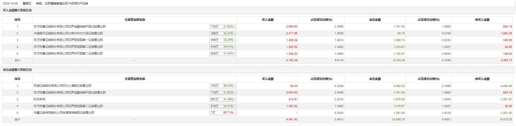 12月8日,银宝山新今日跌停,全天换手率达20.04%,振幅达3.77%。龙虎榜数据显示,营业部席位合计净卖出3941.62万元。其中,机构买入414.51万元,卖出1676.38万元,合计净卖出1261.87万元。此外,财通证券杭州上塘路证券营业部、东方财富证券拉萨金融城南环路证券营业部分别卖出4892.32万元、1761.38万元;东方财富证券拉萨金融城南环路证券营业部、中国银河证券北京中关村大街证券营业部分别买入2654.53万元、2017.95万元。