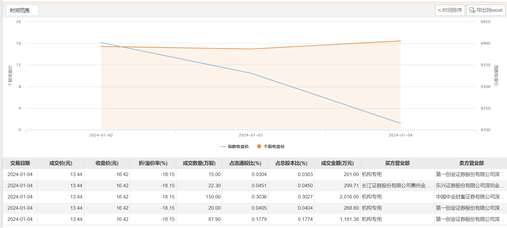 今日大宗交易成交295.2万股,成交额3967.49万元,占当日总成交额的2.18%,成交价13.44元,较市场收盘价折价18.15%。