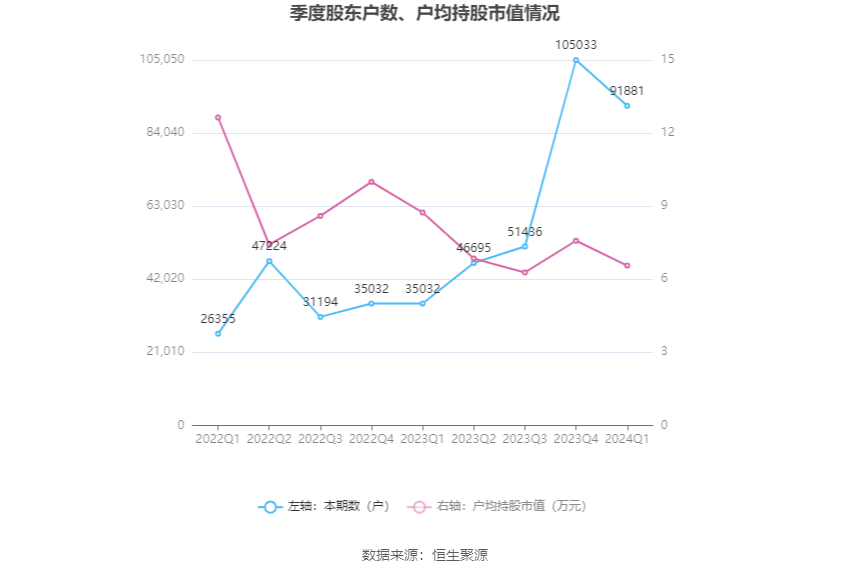 筹码集中度方面,截至2024年一季度末,公司股东总户数为9.19万户,较上年末下降了1.32万户,降幅12.52%;户均持股市值由上年末的7.58万元下降至6.56万元,降幅为13.46%。