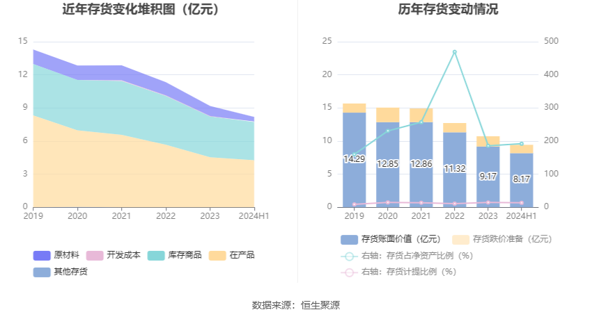 从存货变动来看,截至2024年上半年末,公司存货账面价值为8.17亿元,占净资产的191.87%,较上年末减少9979.91万元。其中,存货跌价准备为1.26亿元,计提比例为13.37%。