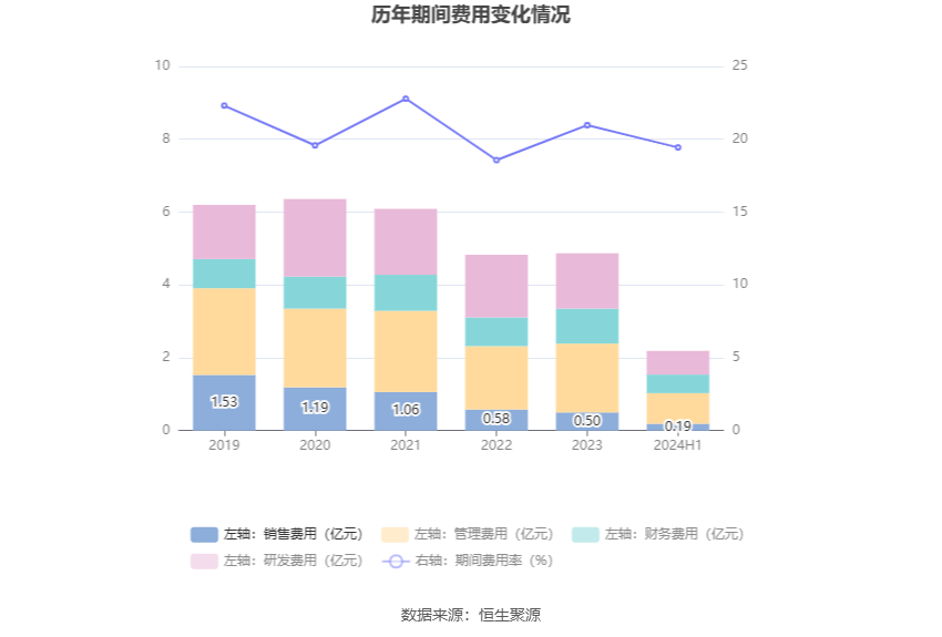 2024年上半年,公司期间费用为2.19亿元,较上年同期增加1078.32万元;期间费用率为19.44%,较上年同期上升1.23个百分点。其中,销售费用同比下降21.65%,管理费用同比增长2.07%,研发费用同比增长1.32%,财务费用同比增长35.58%。