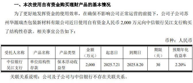7月21日,华源控股(002787)公告称,为了更好地发挥资金的使用效率,在确保不影响公司正常运营的前提下,公司子公司苏州华源瑞杰包装新材料有限公司近日使用自有资金人民币2,000万元向中信银行吴江支行购买了结构性存款。