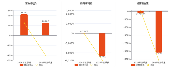 公司截至2025年9月30日,*ST建艺营业总收入为26.66亿元,较去年同报告期营业总收入减少18.05亿元,同比较去年同期下降40.37%。截至2025年9月30日,*ST建艺归母净利润为-3.42亿元,较去年同报告期归母净利润减少3.47亿元,同比较去年同期下降8310.42%。截至2025年9月30日,*ST建艺经营活动现金净流入为-7.13亿元,较去年同报告期经营活动现金净流入减少6.76亿元。