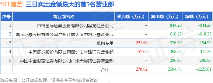 11月3日*ST建艺(002789)龙虎榜数据:机构净卖出154.99万元(3日)