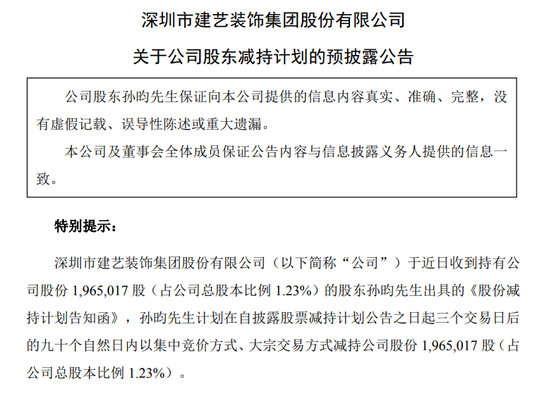 *ST建艺:股东孙昀拟减持不超1.23%股份,不超过196.5万股