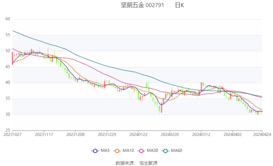 中证智能财讯 坚朗五金(002791)4月25日披露2024年一季报。2024年第一季度,公司实现营业总收入13.66亿元,同比增长0.85%;归母净利润亏损4587.02万元,上年同期亏损5605.15万元;扣非净利润亏损5837.30万元,上年同期亏损5995.77万元;经营活动产生的现金流量净额为-6.10亿元,上年同期为-3.59亿元;报告期内,坚朗五金基本每股收益为-0.14元,加权平均净资产收益率为-0.90%。
