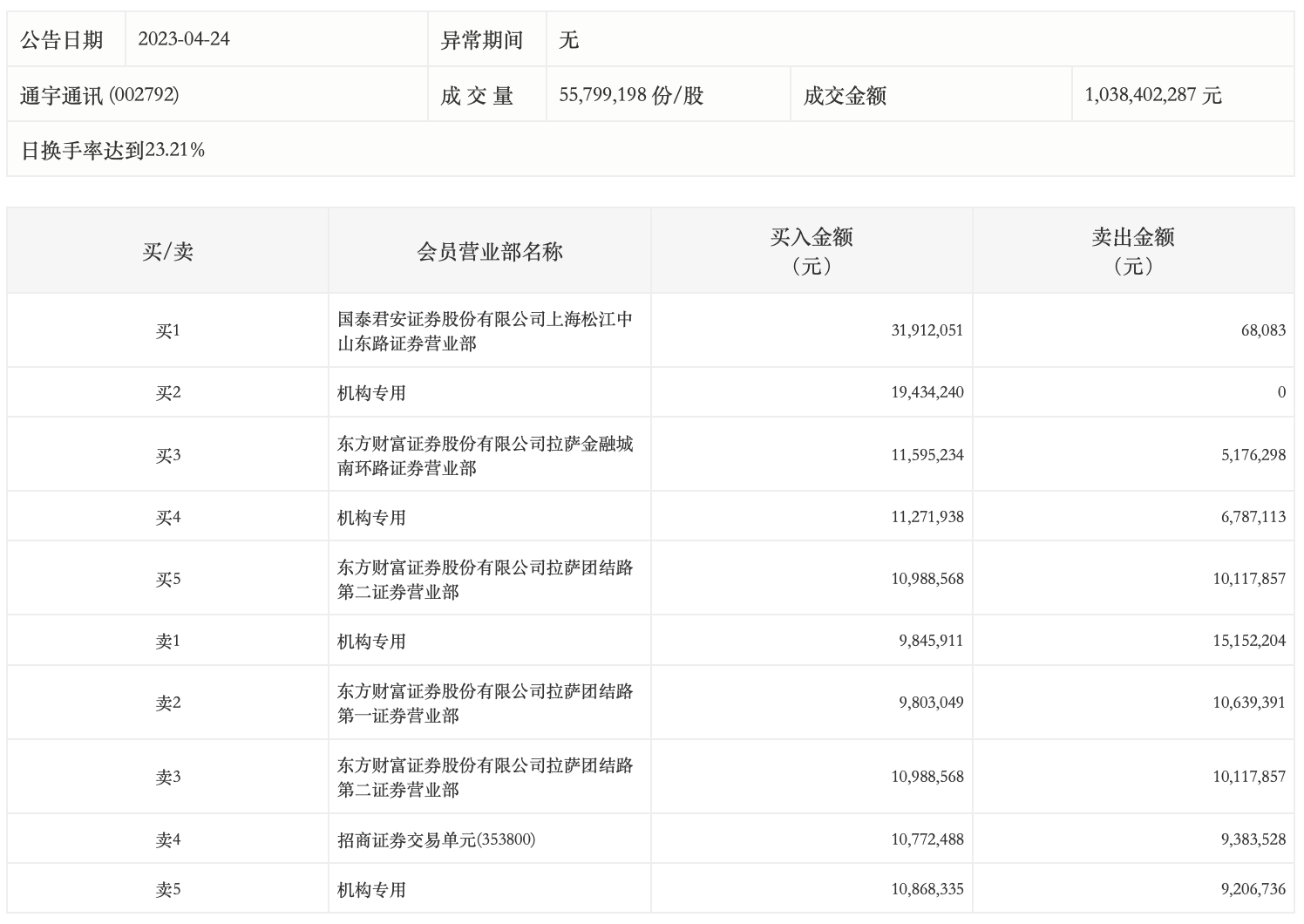 4月24日,通宇通讯今日涨停,龙虎榜数据显示,上榜营业部席位全天成交1.93亿元,占当日总成交金额比例为18.59%。其中,买入金额为1.26亿元,卖出金额为6653.12万元,合计净买入5996.06万元。