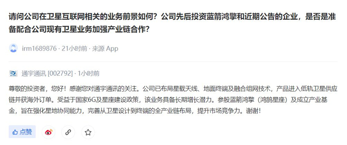 【V观财报|通宇通讯:产品进入低轨卫星供应链并获海外订单】通宇通讯10月14日在投资者互动平台表示,公司已布局星载天线、地面终端及融合组网技术,产品进入低轨卫星供应链并获海外订单。受益于国家6G及星座建设政策,该业务具备长期增长潜力。参股蓝箭鸿擎(鸿鹄星座)及成立产业基金,旨在强化星地协同能力,完善从卫星设计到终端的全产业链布局,提升市场竞争力。(中新经纬APP)