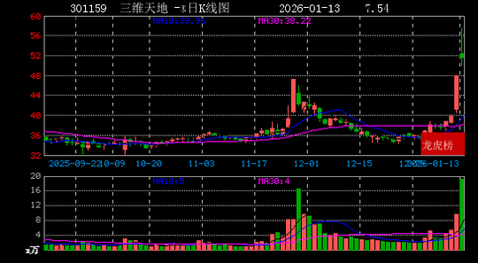 截止收盘,三维天地报收51.49元/股,涨幅7.54%,成交量19万手,成交额10.22亿元,换手率36.1%。今日未涨停。