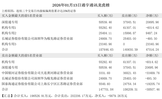 卖出前5席为:机构专用、深股通专用、中国银河证券股份有限公司大连黄河路证券营业部、长城证券股份有限公司深圳华为稼先路证券营业部、国泰海通证券股份有限公司上海长宁区江苏路证券营业部。共计买入:147701.84万元,共计卖出:186209.31万元。