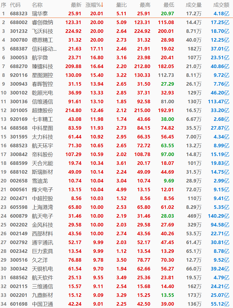 1月23日,商业航天板块全面回暖,瑞华泰(688323.SH)、飞沃科技(301232.SZ)、睿创微纳(688002.SH)、德恩精工(300780.SZ)豪取“20CM”涨停,巨力索具(002342.SZ)三连板领涨,人气股金风科技(002202.SZ)、通宇通讯(002792.SZ)再度涨停,海格通信(002465.SZ)、三维通信(002115.SZ)、中国卫通(601698.SH)等涨超8%。