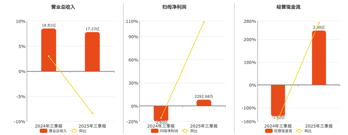 公司营业总收入为17.23亿元,较去年同报告期营业总收入减少1.58亿元,同比较去年同期下降8.37%。归母净利润为2292.68万元。经营活动现金净流入为2.80亿元。