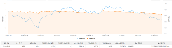 7月9日大宗交易成交2790.05万股,成交额1.34亿元,占当日总成交额的47.93%,成交价4.79元,较市场收盘价4.89元折价2.04%。
