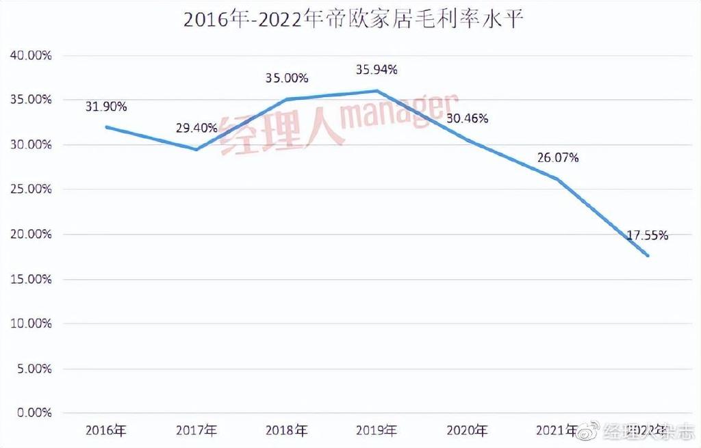 不仅是受地产客户的波及,帝欧家居近几年来的毛利率也是下降明显。2019年至2022年,公司的毛利率分别为35.94%、30.46%、26.07%、17.55%,可以看出,2022年的毛利率较2019年时的高位下降了18.39个百分点,而且对比上市以来的数据,2022年的毛利率创新低。