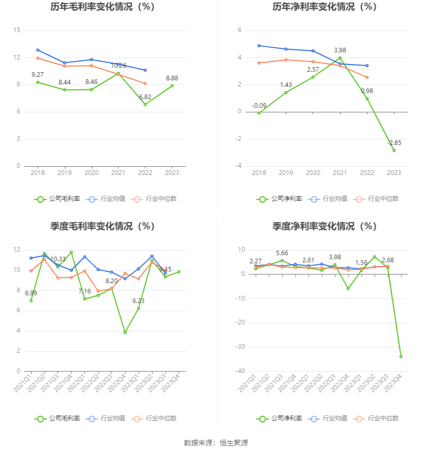 2023年,公司毛利率为8.88%,同比上升2.06个百分点;净利率为-2.85%,较上年同期下降3.83个百分点。从单季度指标来看,2023年第四季度公司毛利率为9.84%,同比上升5.99个百分点,环比上升0.49个百分点;净利率为-33.89%,较上年同期下降27.98个百分点,较上一季度下降36.57个百分点。