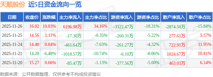 证券之星消息,天顺股份11月26日涨停收盘,收盘价16.02元。该股于10点43分涨停,未打开涨停,截止收盘封单资金为4004.63万元,占其流通市值1.78%。
