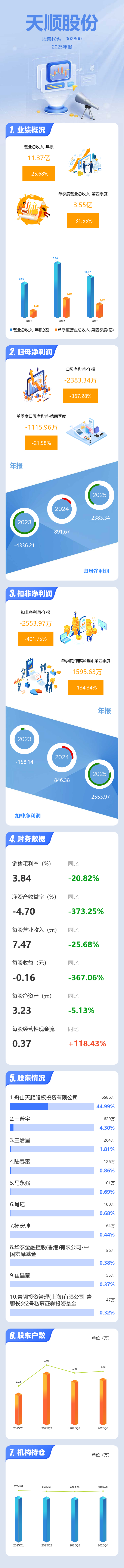 证券之星消息,天顺股份2025年年报显示,当年度公司主营收入11.37亿元,同比下降25.68%;归母净利润-2383.34万元,同比下降367.29%;扣非净利润-2553.97万元,同比下降401.75%;其中2025年第四季度,公司单季度主营收入3.55亿元,同比下降31.56%;单季度归母净利润-1115.96万元,同比下降21.58%;单季度扣非净利润-1595.63万元,同比下降134.34%;负债率48.96%,投资收益103.12万元,财务费用1571.25万元,毛利率3.84%。