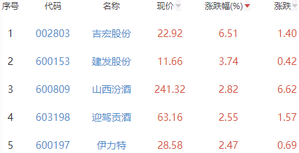 其中,吉宏股份、建发股份、山西汾酒、迎驾贡酒和伊力特位列板块涨幅前五位,涨幅分别为6.51%、3.74%、2.82%、2.55%和2.47%。