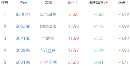 流金科技、均瑶健康、全聚德、*ST皇台和金种子酒位列涨幅榜后五位,涨幅分别为-5.92%、-4.16%、-3.23%、-3.20%和-2.91%。