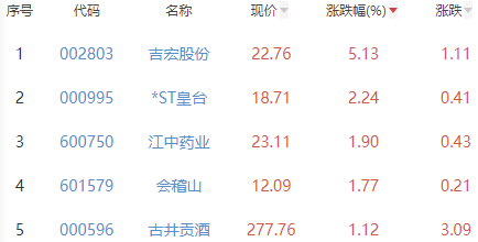 其中,吉宏股份、*ST皇台、江中药业、会稽山和古井贡酒位列板块涨幅前五位,涨幅分别为5.13%、2.24%、1.90%、1.77%和1.12%。