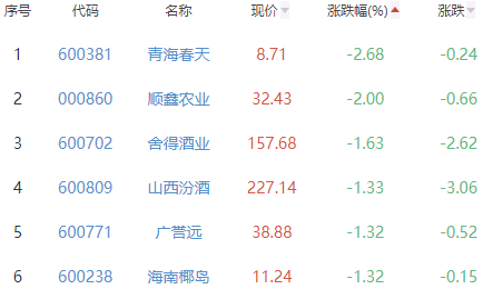 青海春天、顺鑫农业、舍得酒业、山西汾酒、广誉远和海南椰岛位列涨幅榜后五位,涨幅分别为-2.68%、-2.00%、-1.63%、-1.33%、-1.32%和-1.32%。