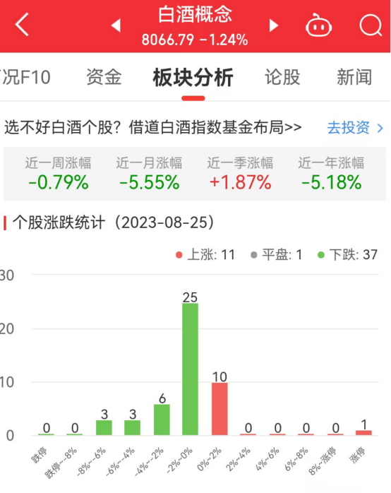 中国经济网北京8月25日讯今日,白酒概念板块整体跌幅1.24%,其中11只股票上涨,1只股票平盘,37只股票下跌。