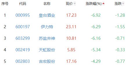 皇台酒业、伊力特、苏盐井神、天虹股份、吉宏股份位列涨幅榜后五位,涨幅分别为-6.92%、-6.29%、-6.16%、-5.34%、-4.29%。