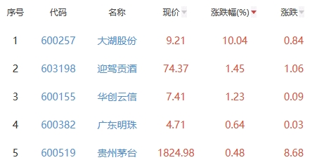 其中,大湖股份、迎驾贡酒、华创云信、广东明珠、贵州茅台位列板块涨幅前五位,涨幅分别为10.04%、1.45%、1.23%、0.64%、0.48%。