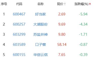 好当家、大湖股份、苏盐井神、口子窖、华创云信位列涨幅榜后五位,涨幅分别为-5.94%、-4.34%、-1.71%、-0.87%、-0.39%。