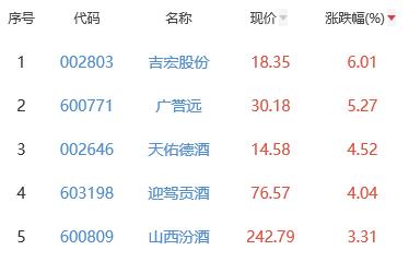 其中,吉宏股份、广誉远、天佑德酒、迎驾贡酒、山西汾酒位列板块涨幅前五位,涨幅分别为6.01%、5.27%、4.52%、4.04%、3.31%。