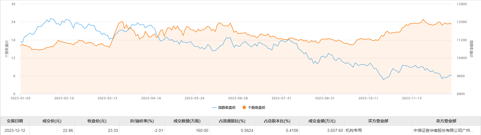 今日大宗交易成交160万股,成交额3657.6万元,占当日总成交额的13.79%,成交价22.86元,较市场收盘价折价2.01%。