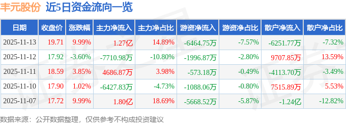 11月13日的资金流向数据方面,主力资金净流入1.27亿元,占总成交额14.89%,游资资金净流出6464.75万元,占总成交额7.57%,散户资金净流出6251.77万元,占总成交额7.32%。
