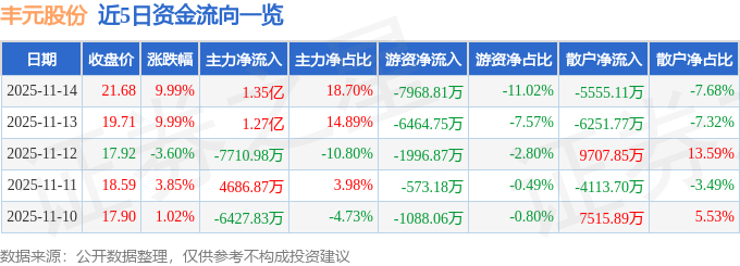 证券之星消息,丰元股份11月14日涨停收盘,收盘价21.68元。该股于9点39分涨停,未打开涨停,截止收盘封单资金为1.05亿元,占其流通市值1.73%。