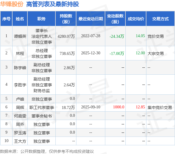 华锋股份近半年内的董监高及核心技术人员增减持详情如下: