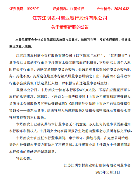 10月11日,江苏江阴农村商业银行股份有限公司发布关于董事辞职的公告,卞丹娟女士因个人原因辞去本行董事、关联交易控制委员会委员、金融消费者权益保护委员会委员职务,其他不变。截至本公告日,卞丹娟女士持有本行股份490,038股,不存在应当履行而未履行的承诺事项。